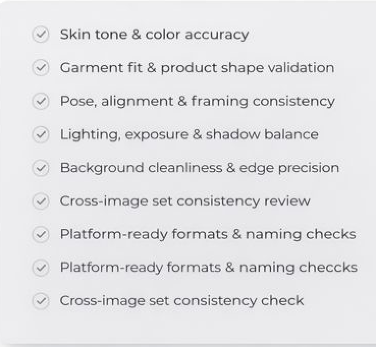 Dedicated QC checks ensure accurate skin tones, garment fit, pose alignment, clean backgrounds, and consistent framing across the full collection.