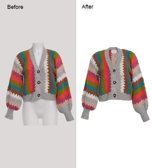 We handle small to large apparel collections and also specialize in creating ghost mannequin images from model-worn photos, helping brands convert lookbook or campaign shoots into polished, e-commerce–ready product visuals without reshooting.