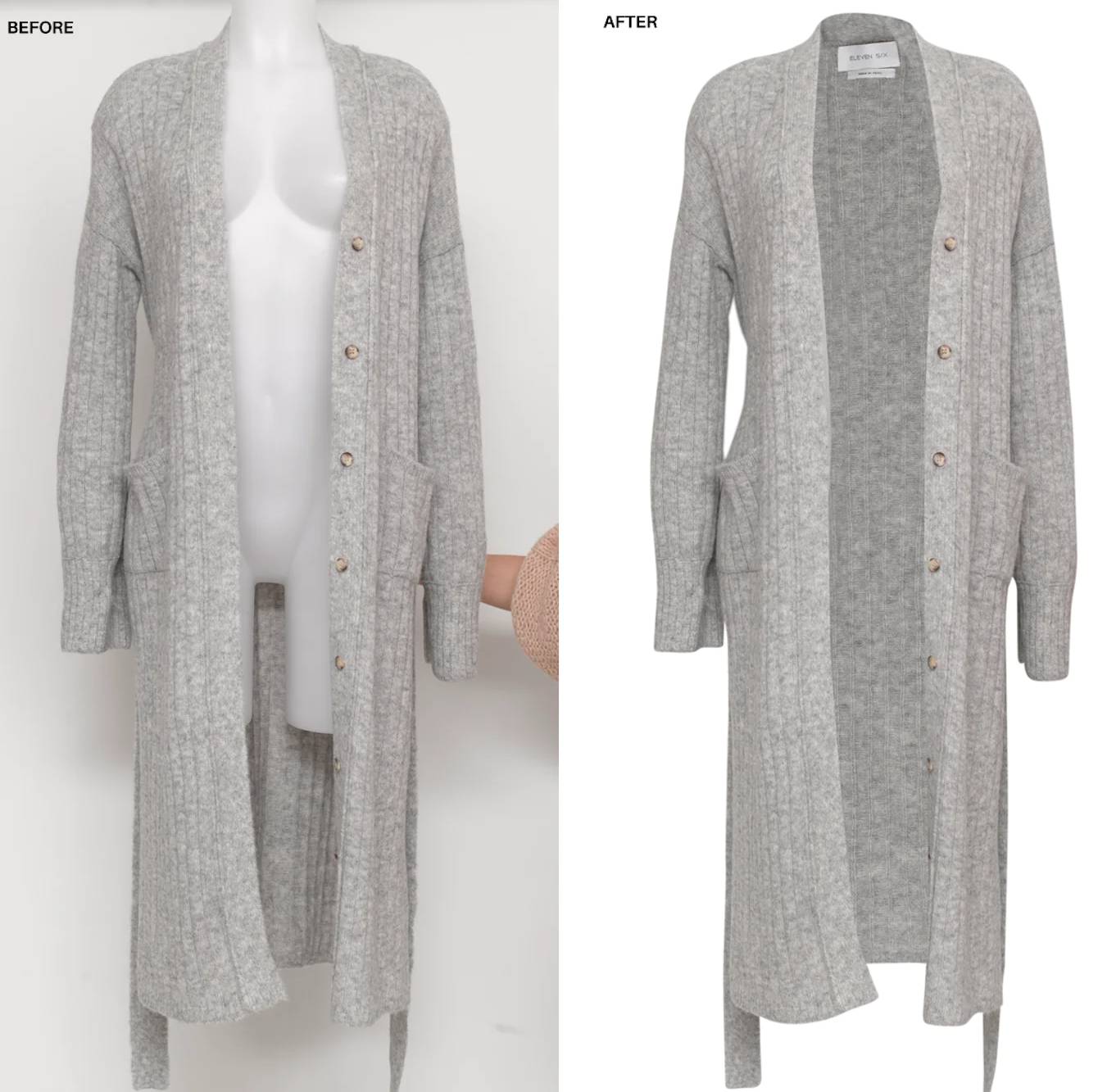 When garments are photographed on models, we remove the model and reconstruct the inner structure so the product retains a worn, dimensional look.
